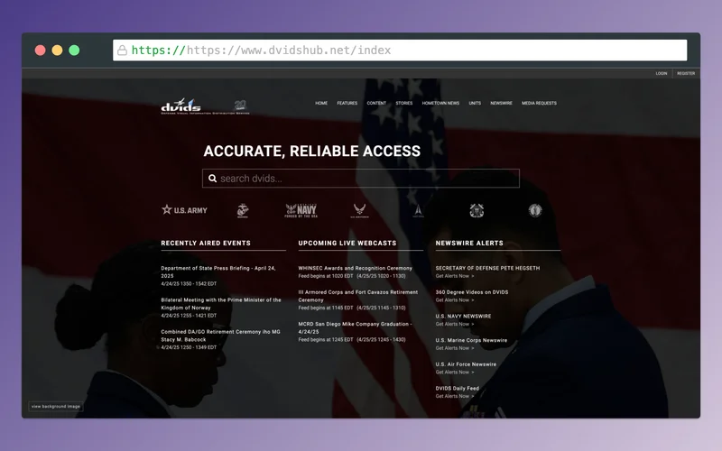 - Live Events: Live webcasts of significant military events, briefings, and ceremonies.