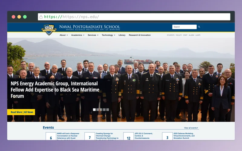 NPS.edu clearly represents an institution embedded within the U.S. Department of the Navy and serving the broader Department of Defense (DoD). It educates officers from all branches of the U.S. military (Navy, Marine Corps, Army, Air Force, Space Force, Coast Guard), as well as DoD civilians and officers from allied nations. The website details its organizational structure under the Navy and its collaborative research efforts with various government agencies, military commands, and academic institutions.